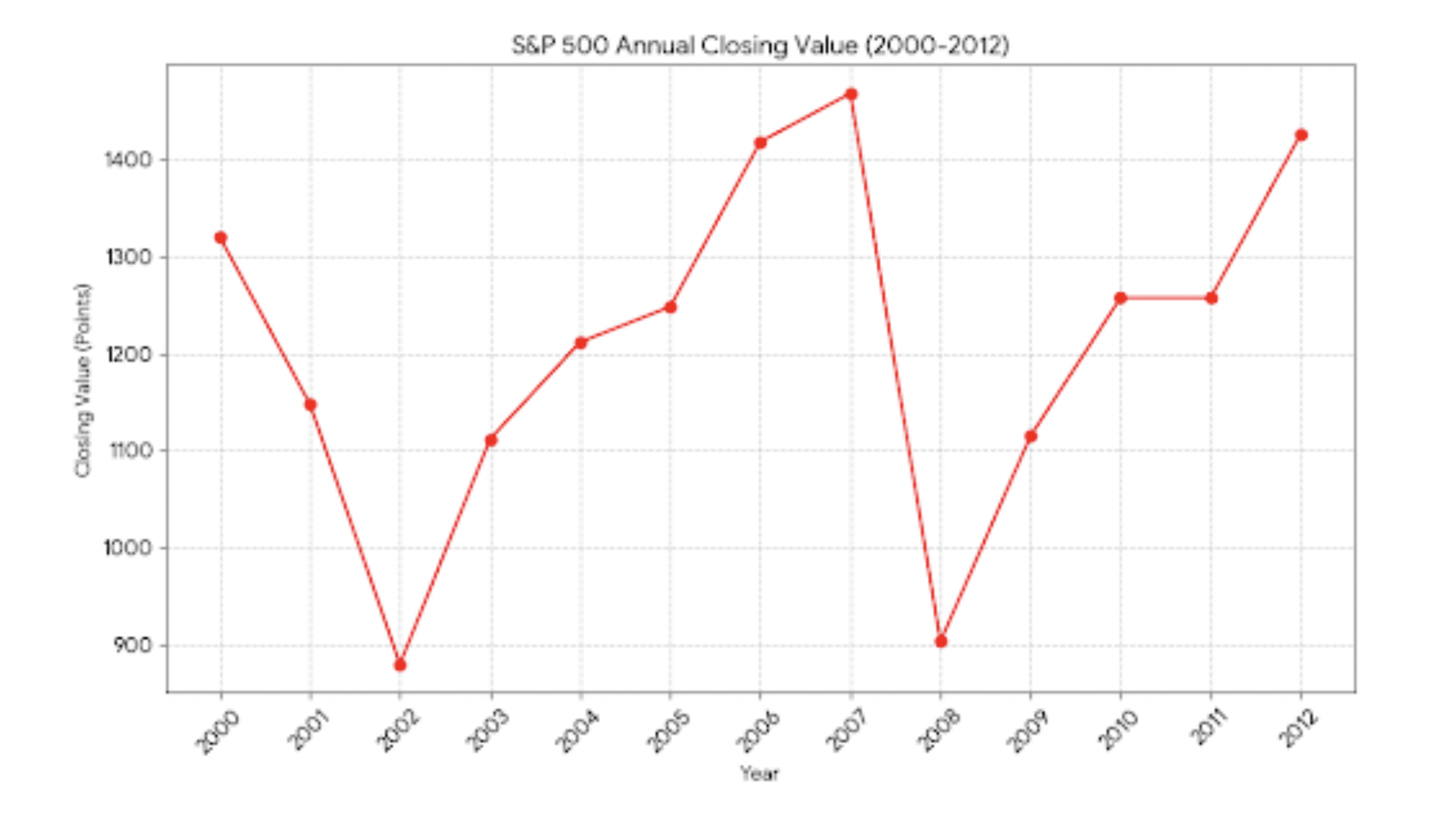 Between 2000 and 2012, the S&P 500 price index barely moved. Twelve years. Two major bear markets and the recoveries that followed.